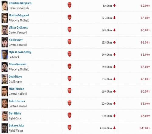 北京时间12月9日,德转公布了最新一期的英超球员身价榜,阿森纳这边,萨利巴和廷贝尔身价上涨1000万,萨卡下跌1000...