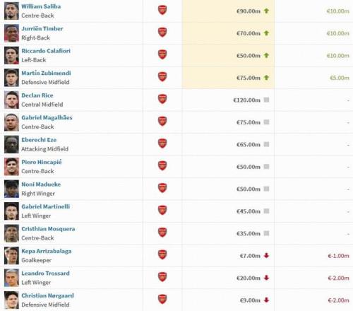 北京时间12月9日,德转公布了最新一期的英超球员身价榜,阿森纳这边,萨利巴和廷贝尔身价上涨1000万,萨卡下跌1000万欧至1.3亿欧。