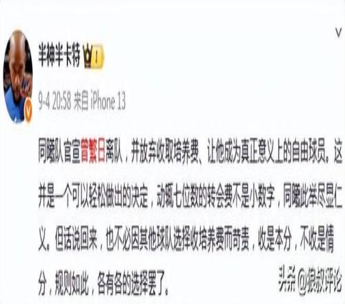 媒体人“半神半卡特”发文点评:这并不是一个可以轻松做出的决定,动辄七位数的转会费不是小数字,同曦此举尽显仁义。但话说回来,也不必因其他球队选择收培养费而苛责,收是本分,不收是情分,规则如此,各有各的选择罢了。