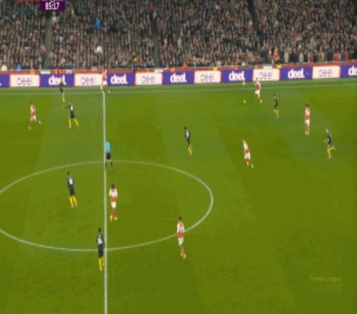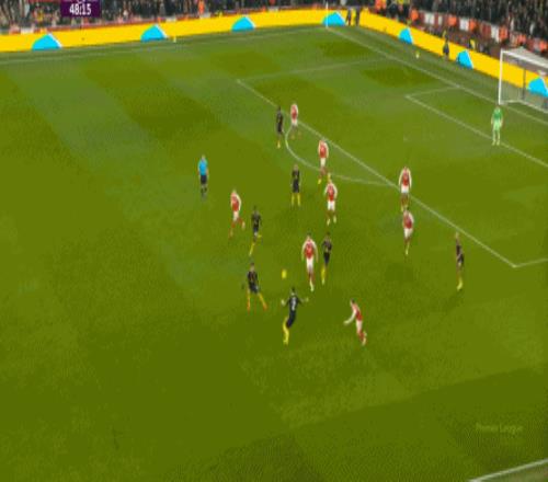 但这次进攻成型也有偶然性,因为阿森纳这一侧的中场和边后卫全部随着进攻球员压上去了,这是反击能出现的关键: